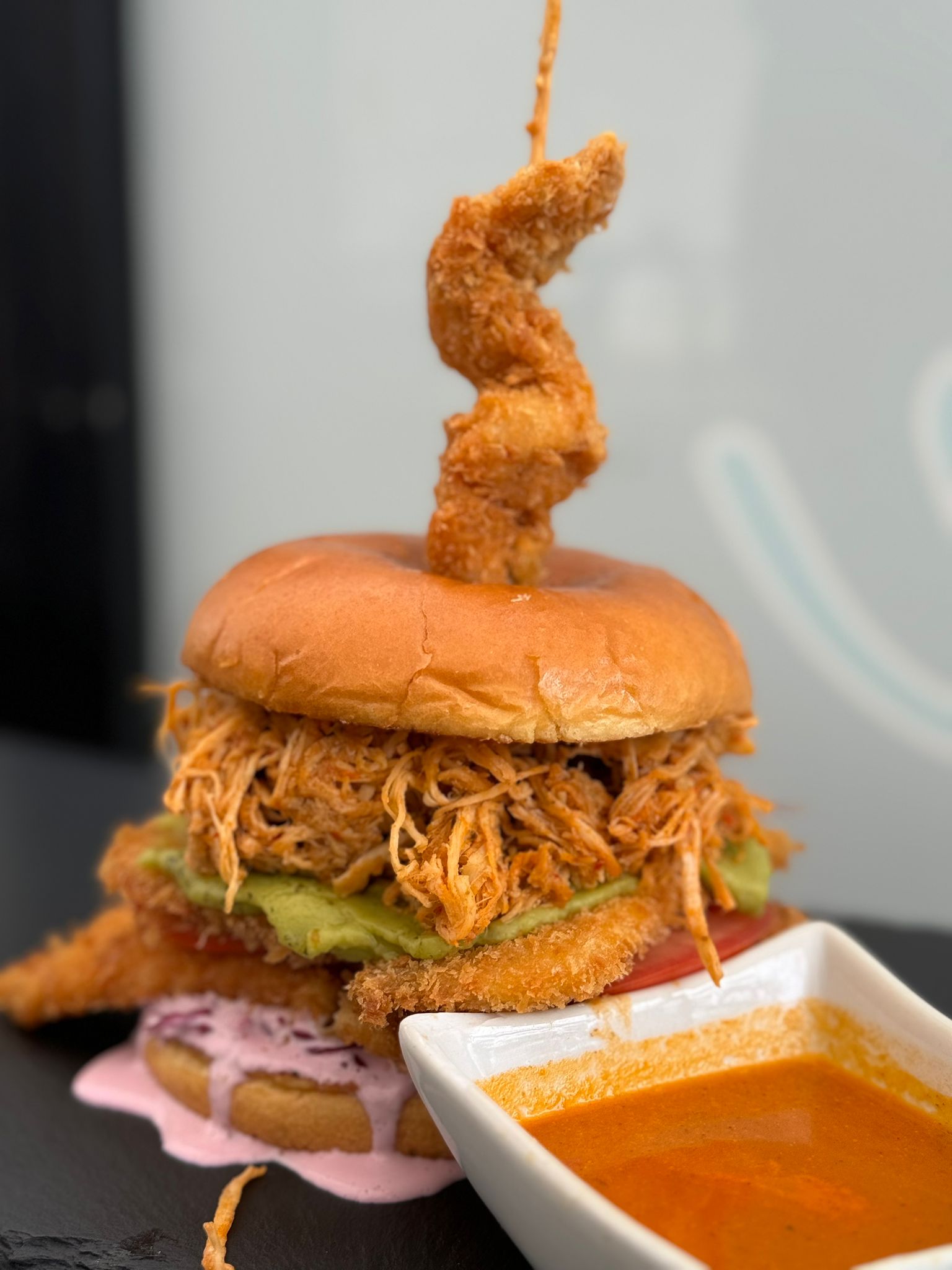 Carne de Pollo Mechado (150 gr) + Filete Pechuga empanada (150 gr). C/ Queso ahumado , Ensalada de col morada con mayonesa, Guacamole y Salsa de la casa
