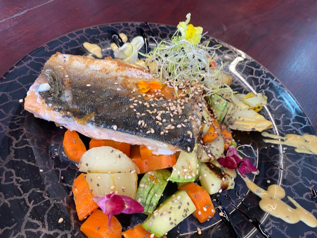 Bacalao en suprema con salsa confitada, papas arrugadas y verdura a la plancha