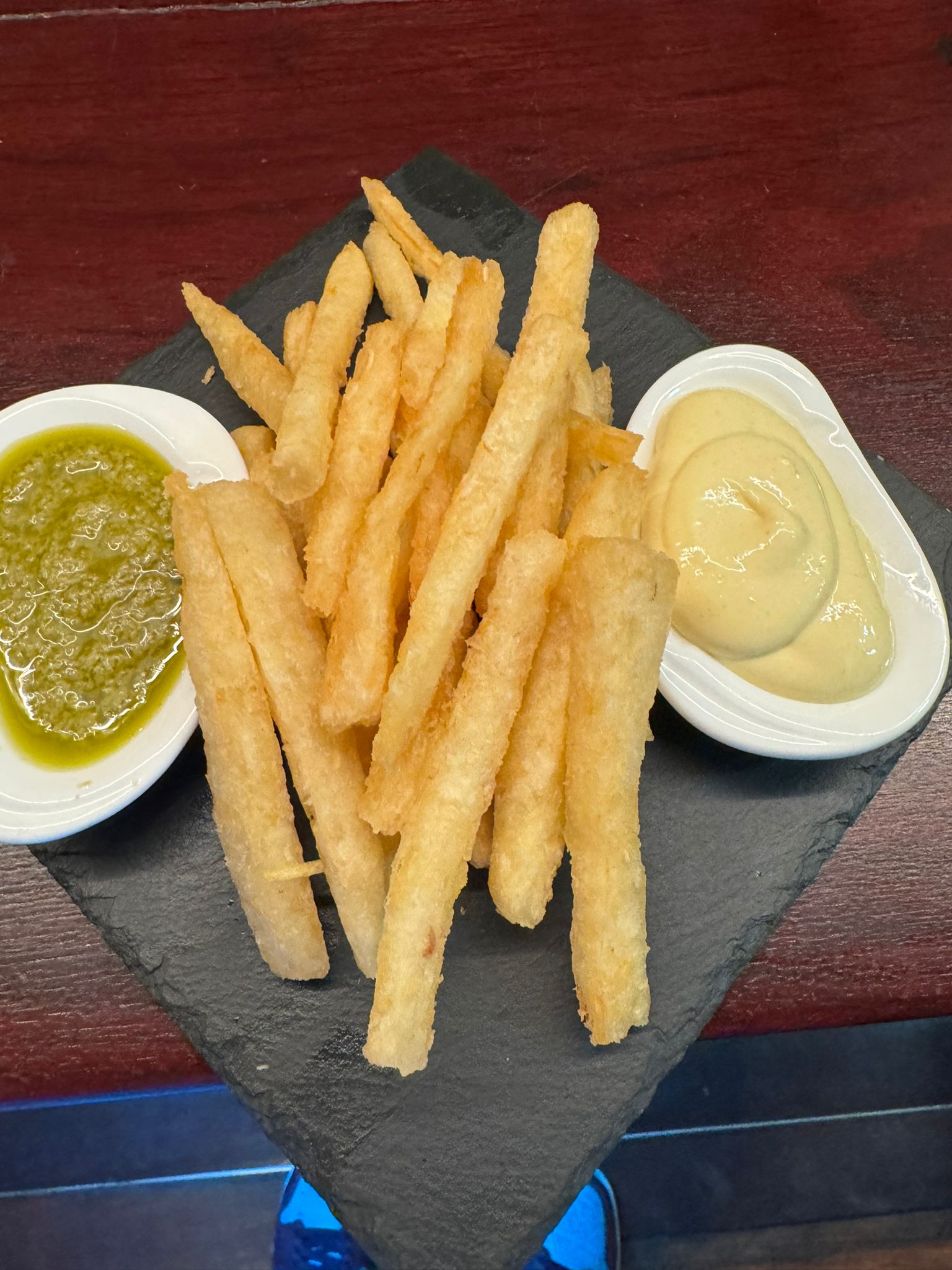 Tiras de yuca fritas crujiente con mojo verde y salsa de la casa