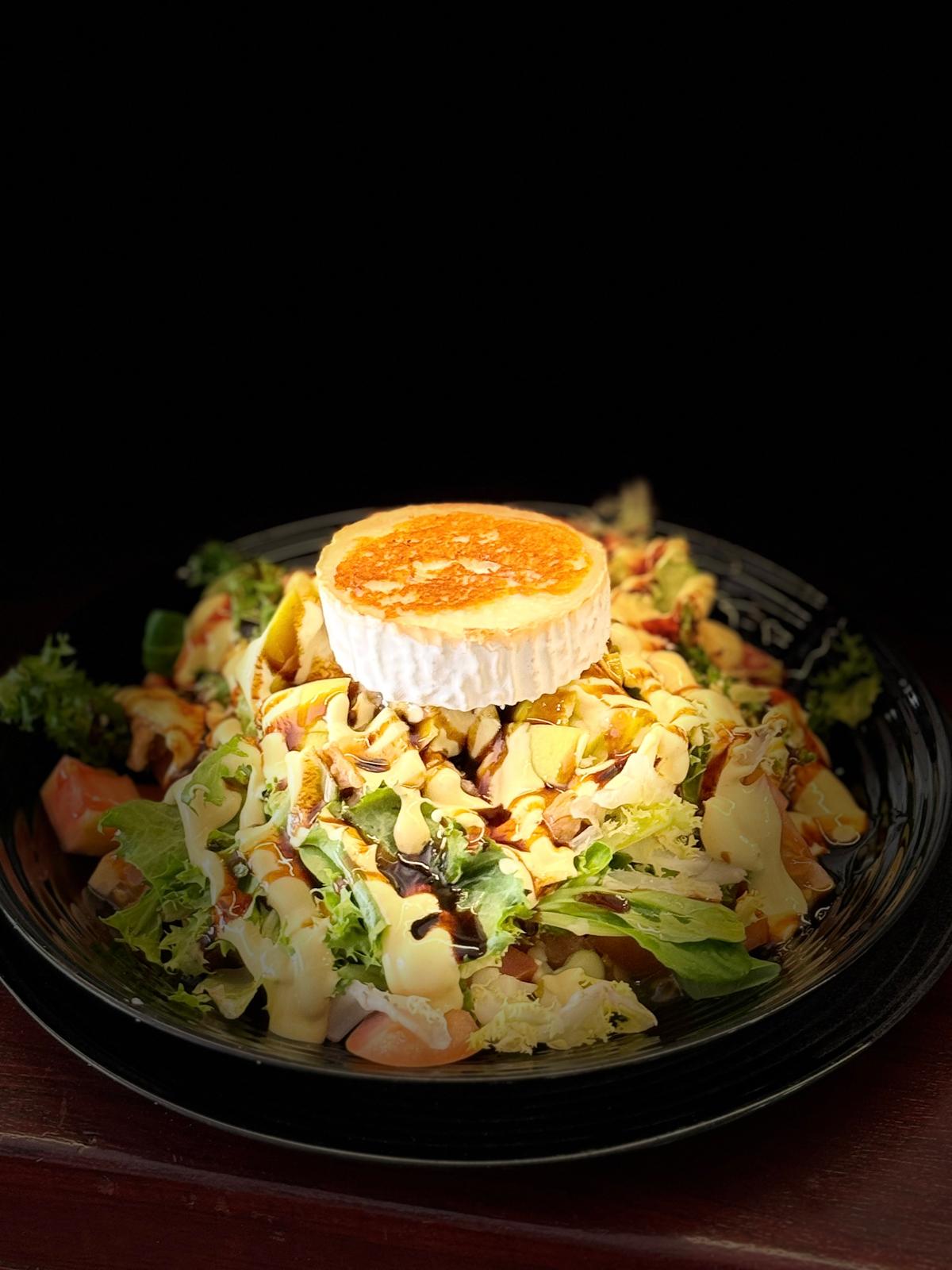 Variado de lechuga con tomate, frutos secos, manzana, queso de cabra a la plancha, miel y salsa de la casa