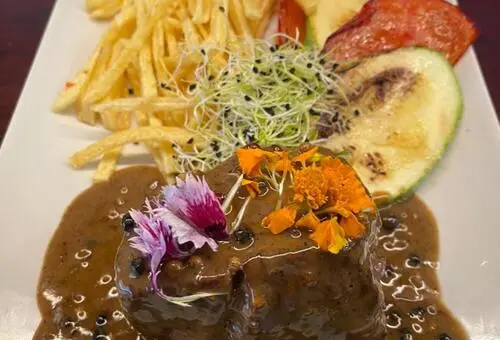 Solomillo (220 gr), con salsa a la Pimienta de la casa, acompañado de papas fritas y verduras a la plancha.