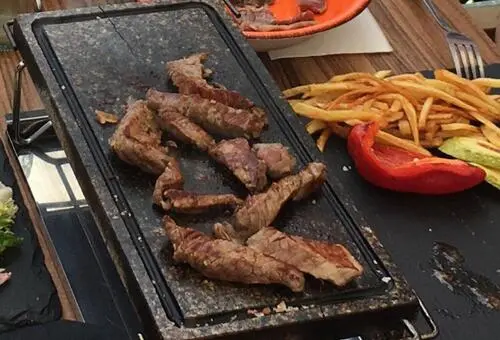 Solomillo en tiras (200 gr) a la Piedra, con ajo y perejil, acompañado de papas fritas y verduras a la plancha.